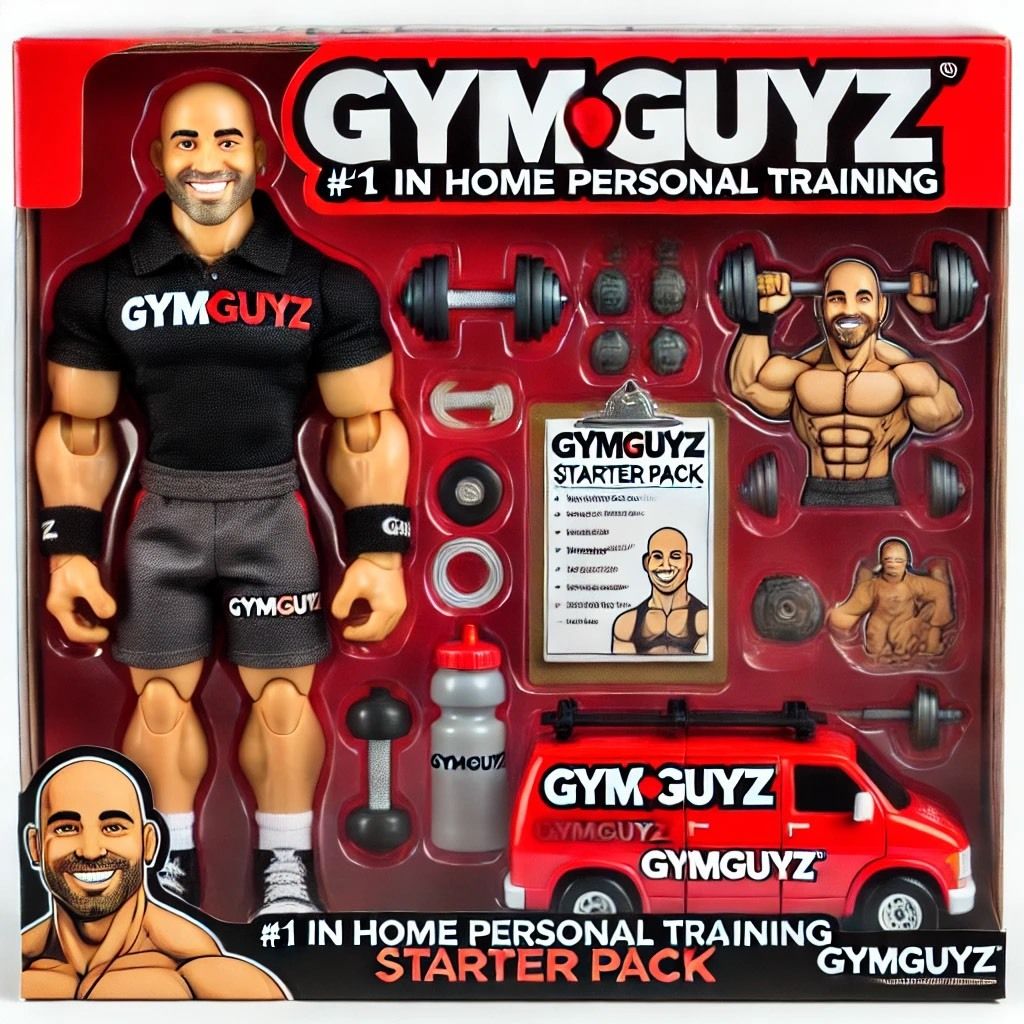 "Create a muscular bald action figure inside toy packaging labeled 'GYMGUYZ Starter Pack'. Outfit the figure in black athletic gear. Add dumbbells, protein shaker, resistance bands, a red GYMGUYZ van, and workout clipboard. Use a bold red and black toy box design, like 90s action figures."