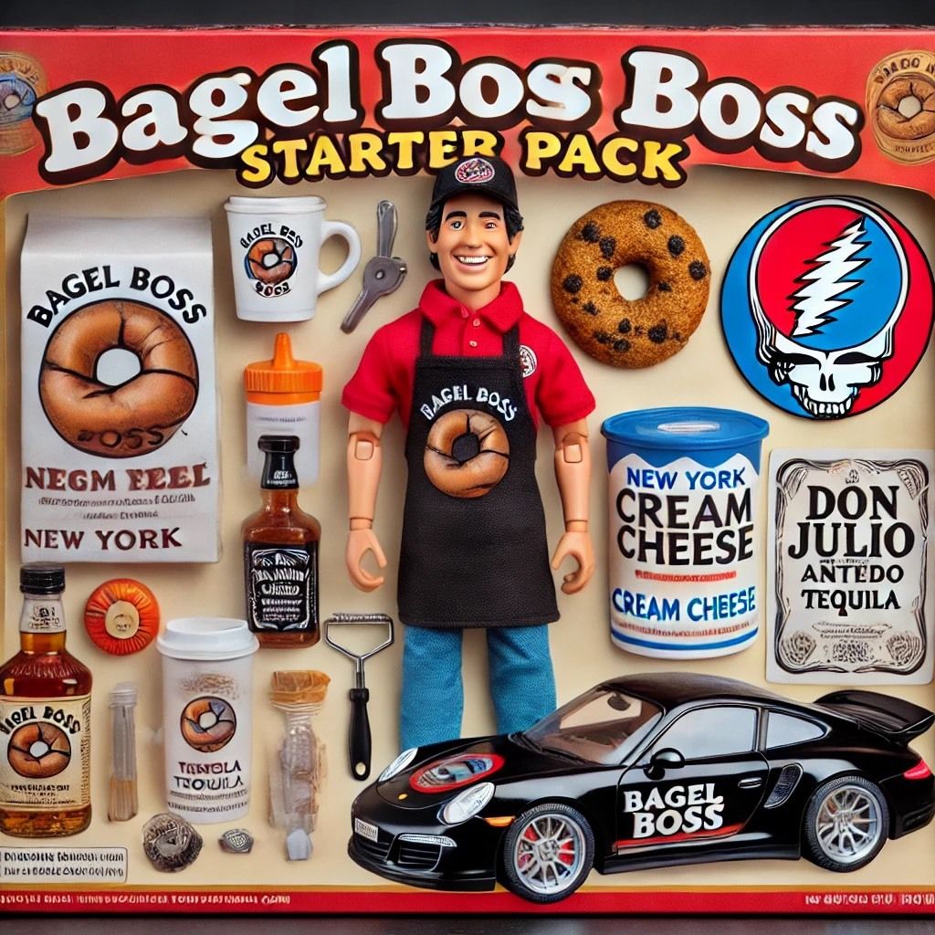 "Create a toy-style action figure of a smiling man in a red polo and Bagel Boss apron, holding a coffee cup. Place the figure inside a clear plastic toy box labeled 'Bagel Boss Boss Starter Pack'. Surround him with accessories like a cream cheese tub, bagel, Porsche toy car with logo, and a Grateful Dead sticker. Make the layout fun and nostalgic, like a 90s toy."